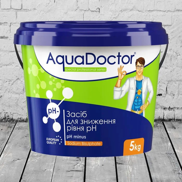 Швидкорозчинний препарат AquaDoctor pH- (Minus) призначений для зниження кислотності води в басейні до нормованого рівня (7.2-7.6). Вода з оптимальним рівнем pH, збільшує ефективність дезінфікуючих засобів та коагулянтів, а також запобігає подразненню слизових оболонок людини та випадання вапняних відкладень на дні та стінках басейну. На основі natriumhydrogensulfat (NaHSO₄гідросульфат натрію).