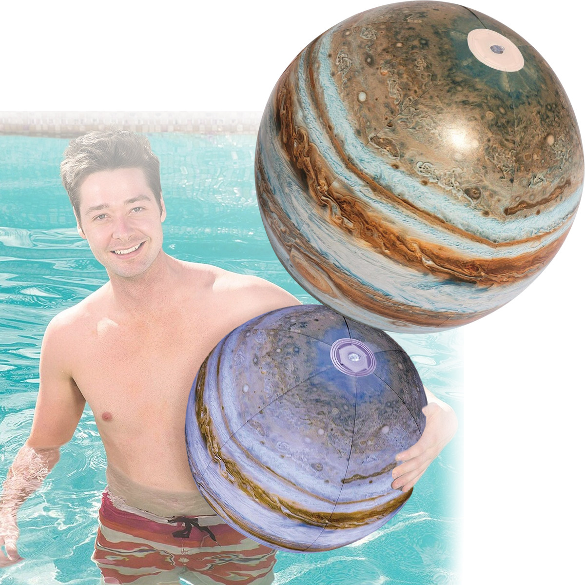 Візьміть із собою на відпочинок частинку далекого космосу! Надувний м'яч для пляжу, в барвистому дизайні якого легко впізнається планета Юпітер, зробить водні забави ще цікавішими і веселішими. Завдяки вбудованому підсвічуванню з ним буде приємно грати не тільки під яскравим сонячним промінням, але і після заходу сонця.