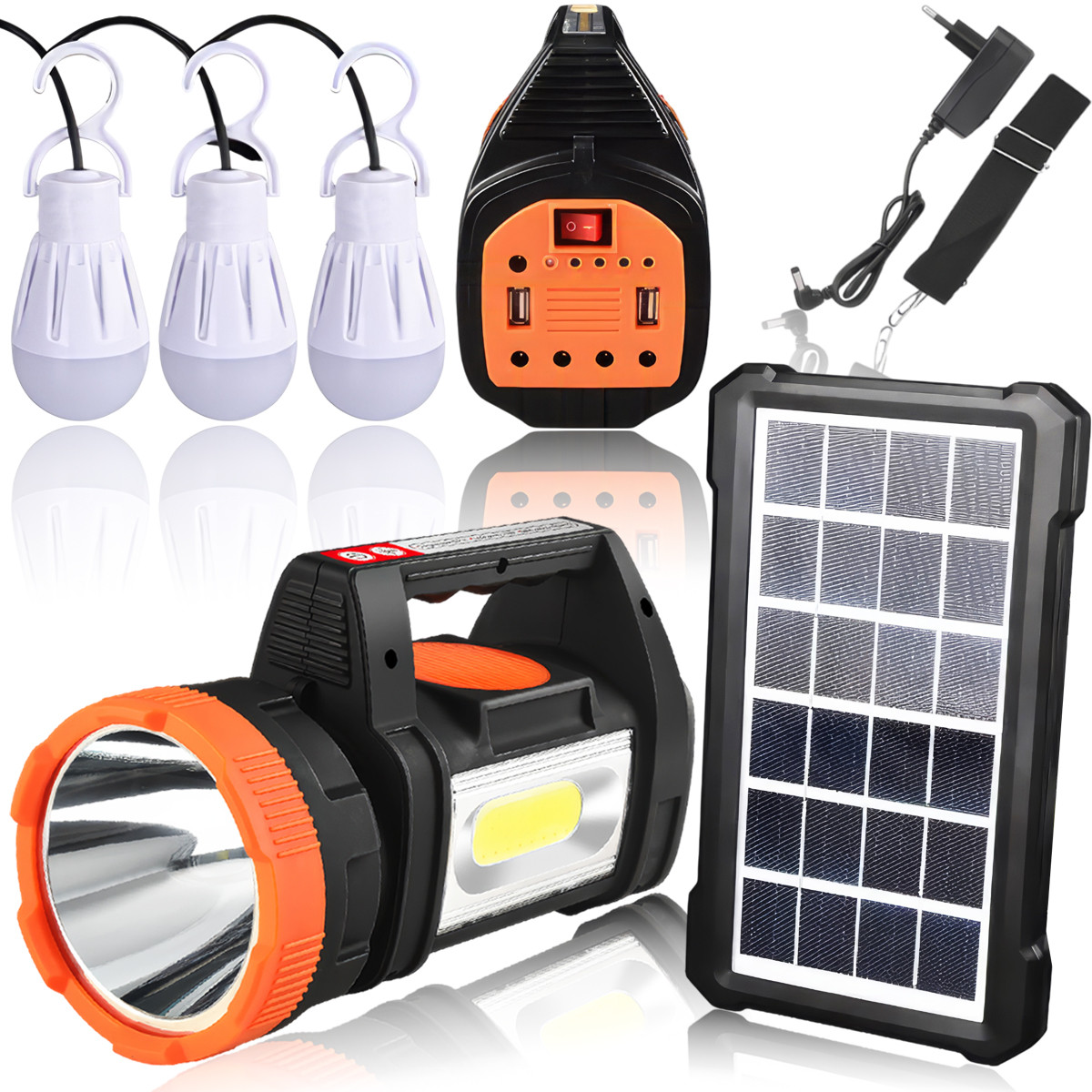 Це високоякісний прожектор з FM-радіо та MP3-плеєром. Структура всієї системи проста, а встановлення досить просте в експлуатації. Він обладнаний 15-ватним прожектором і бічним LED ліхтарем, а також виходом USB 5V-1A, що дає змогу заряджати телефони від внутрішньої 6-вольтової батареї.